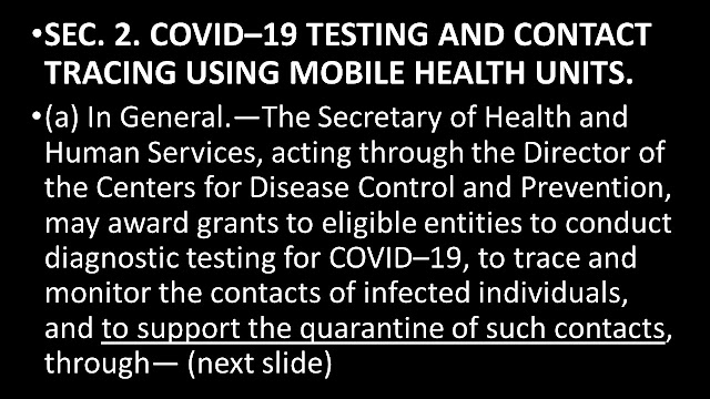 Everything on this and the following slides is copied directly from the Bill—portions being underlined for emphasis. Its “short title” is as noted. Again, concern was raised that this bill is a step toward unprecedented government control, as stated in its title – “COVID–19 Testing, Reaching, And Contacting Everyone (TRACE) Act”